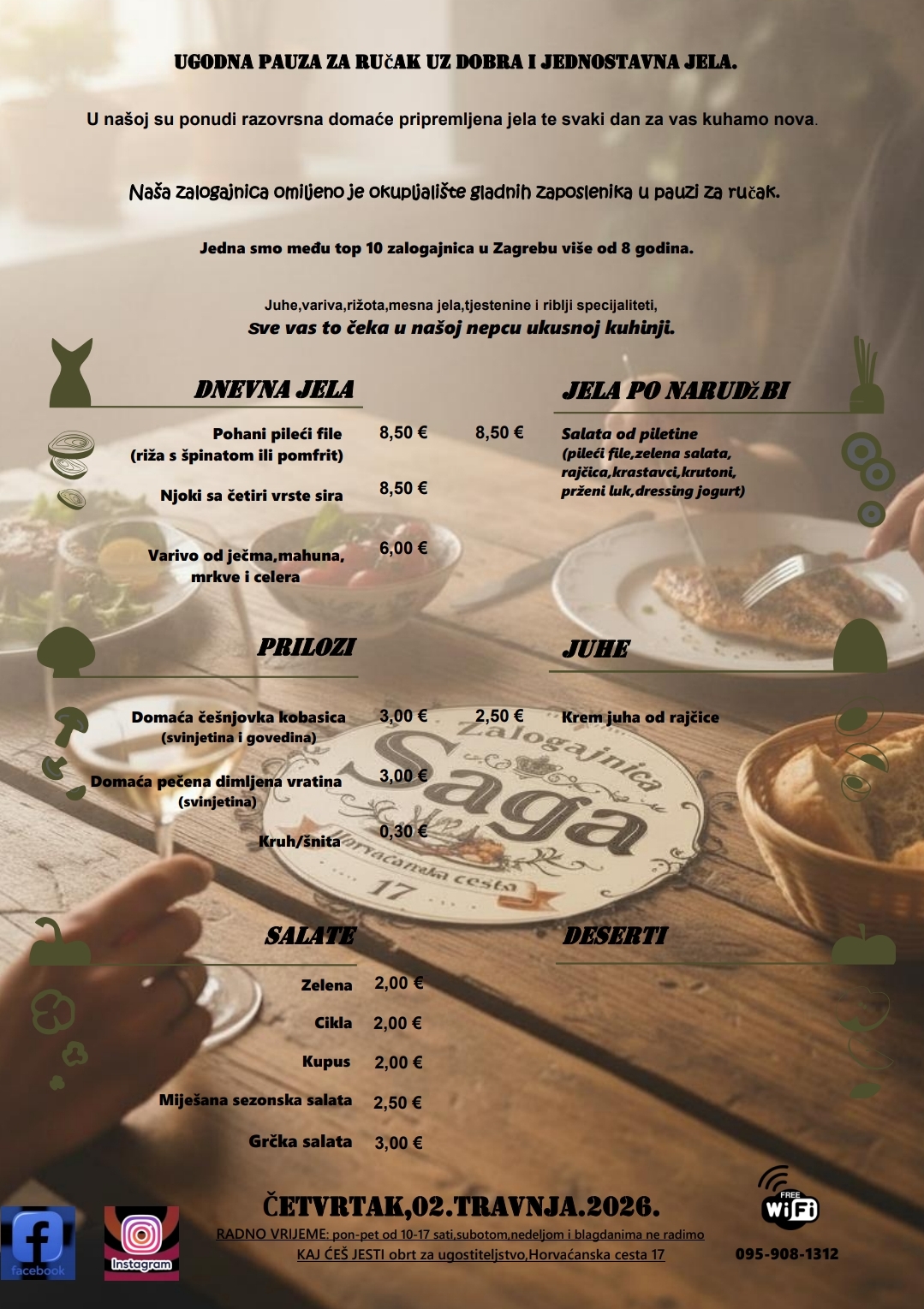 Ugodna pauza za ručak uz dobra i jednostavna jela – ako to zvuči kao plan, posjetite nas. Zalogajnica Saga by Kaj ćeš jesti – to je sinonim za svježu hranu i dobre ponude. Naša zalogajnica omiljeno je okupljalište gladnih zaposlenika u pauzi za ručak tijekom radnog dana. Uživajte prilikom jela na našoj terasi(sezonski). U našoj su ponudi raznovrsna domaće pripremljena jela,od juha,variva,mesnih jela do rižota,tjestenina te kolača. Dođite i uvjerite se u domaću,nepcu ukusnu kuhinju.